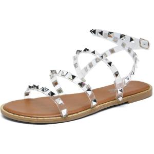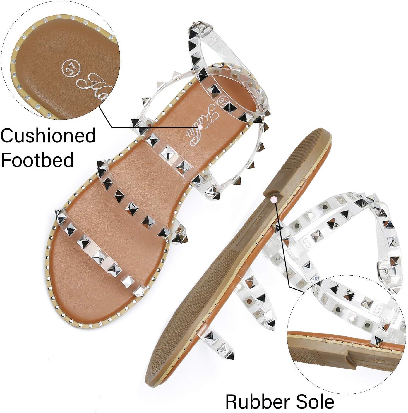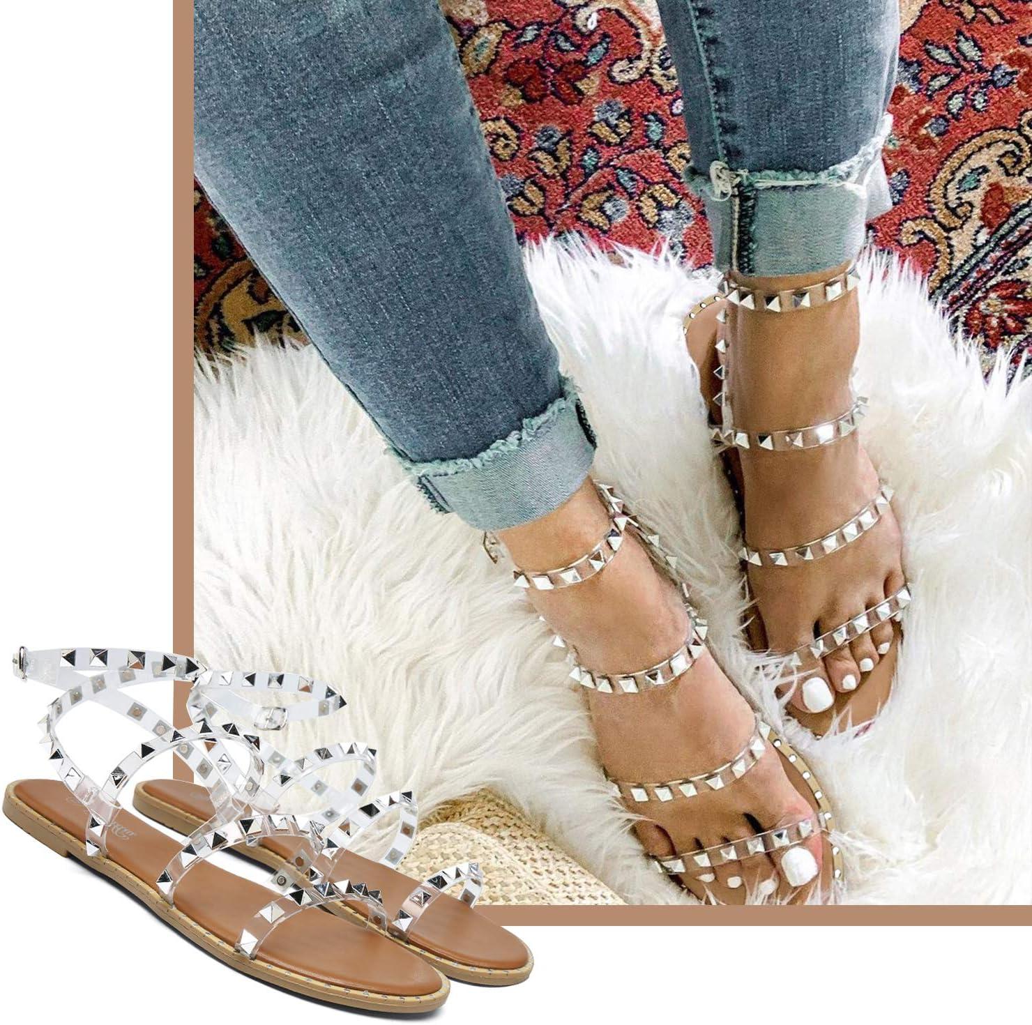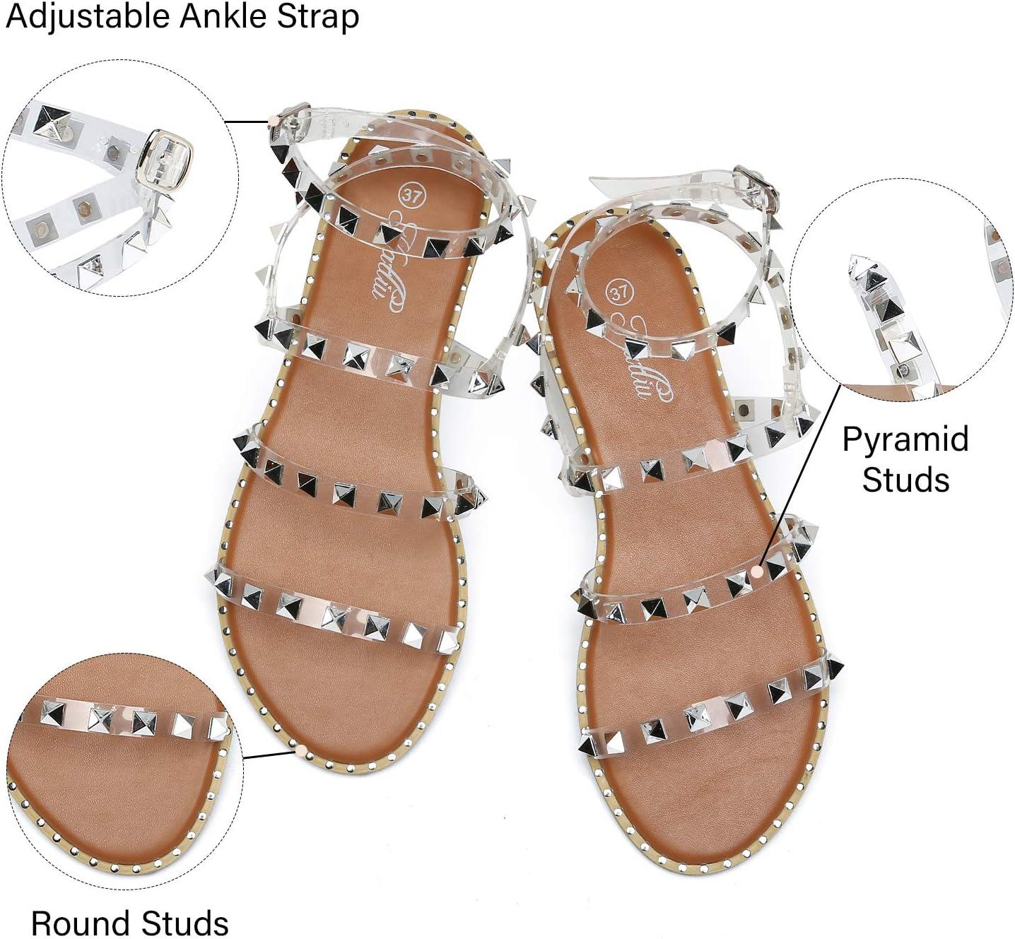 katliu Women’s Flat Sandals Strappy Studded Sandals Gladiator Sandals with Ankle Strap(Clear)