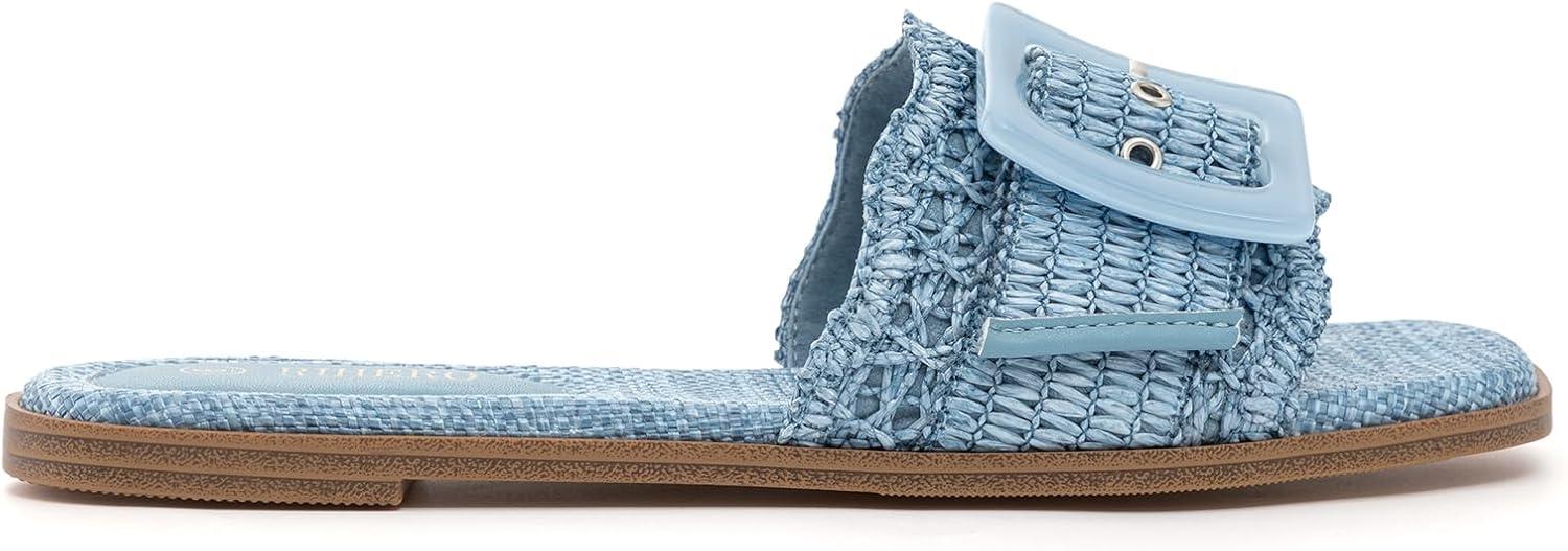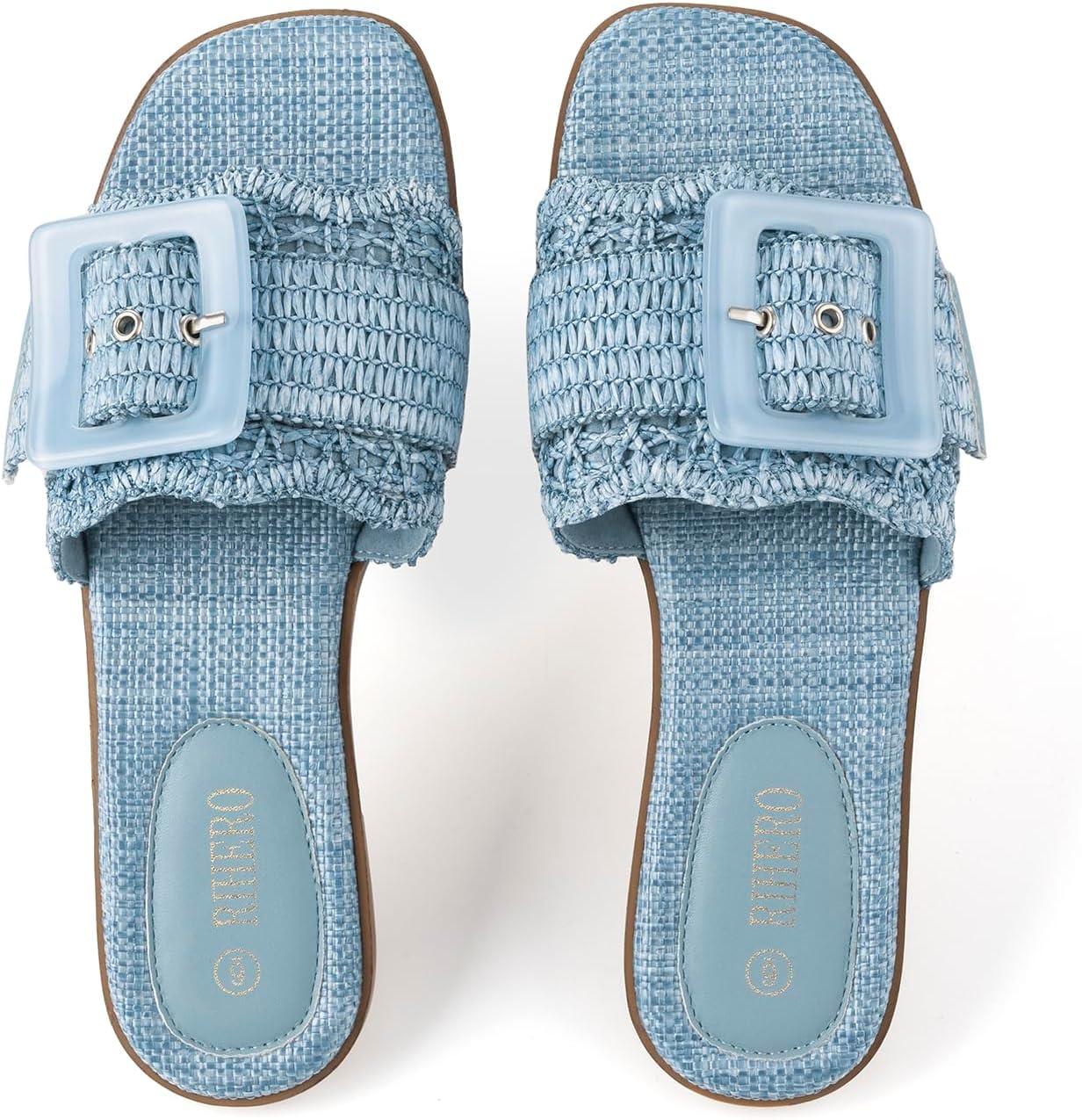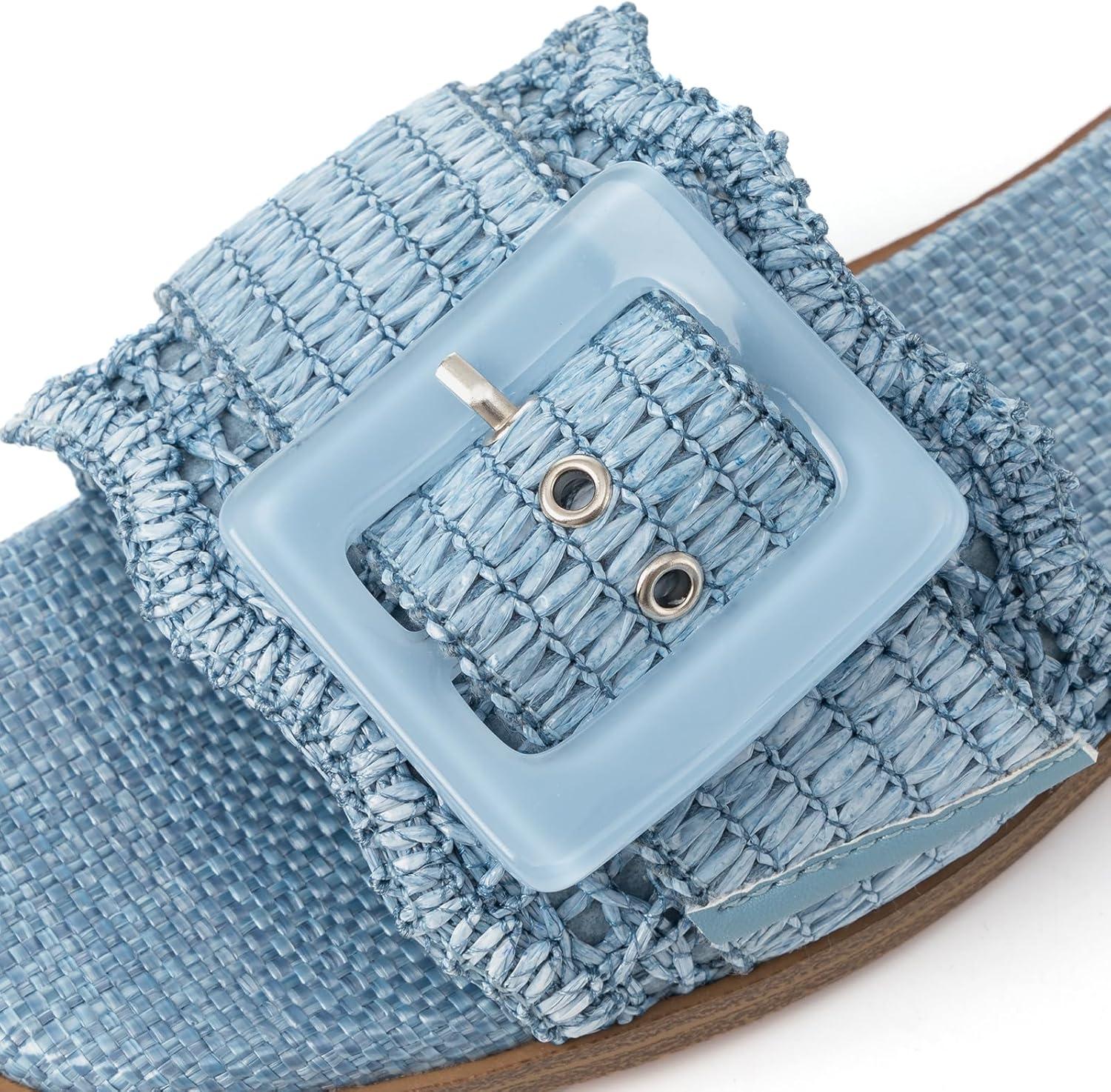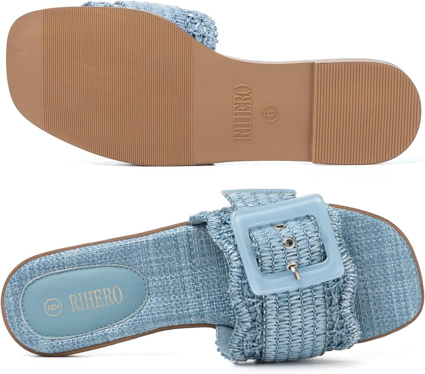 Rihero Women’s Raffia Flat Sandals Square Open Toe Summer Beach Slip On Woven Buckle Slide Sandals(Blue)