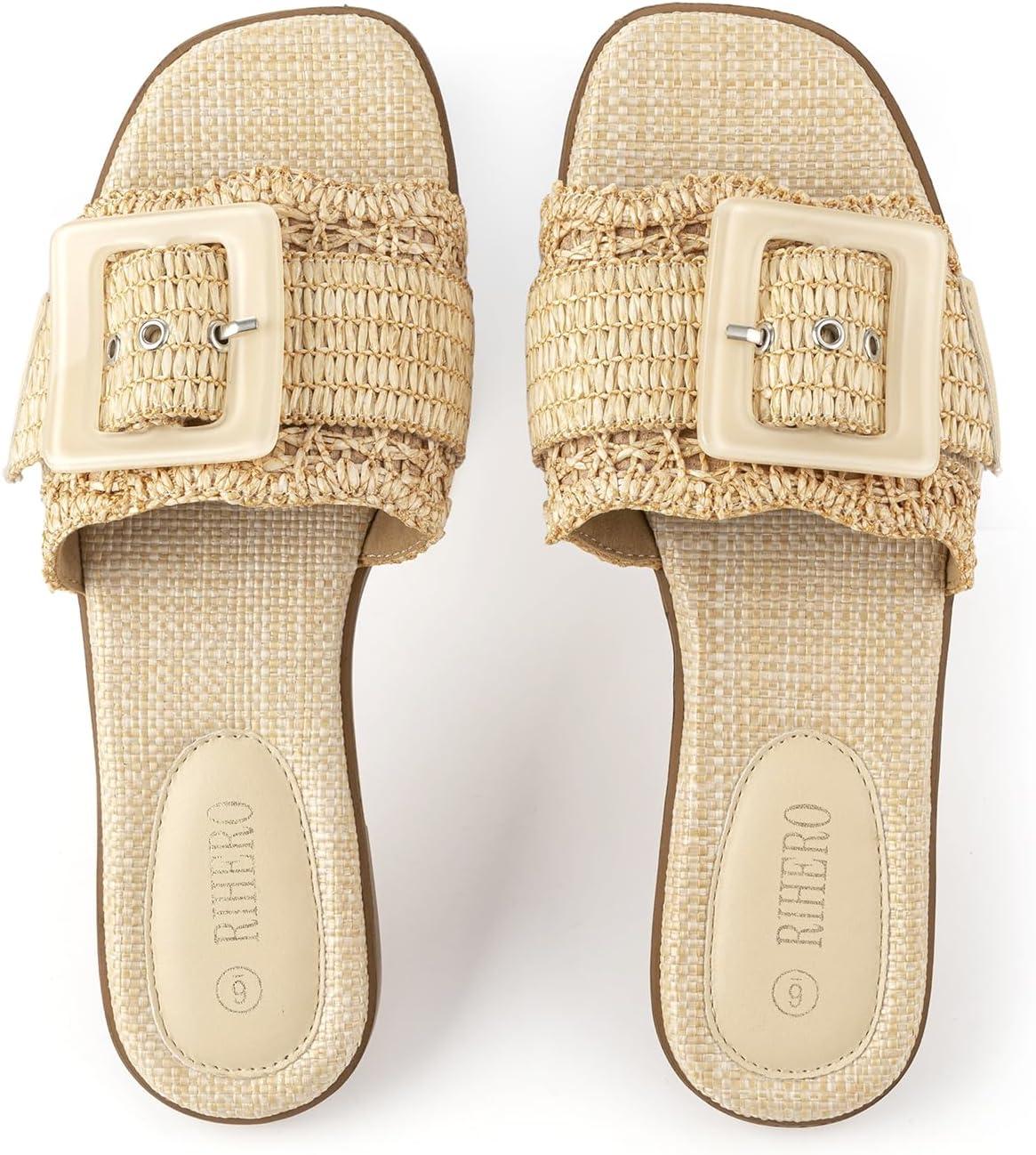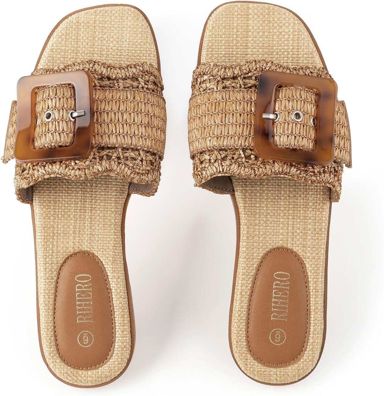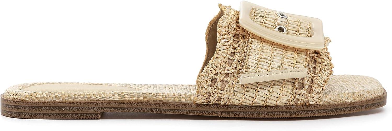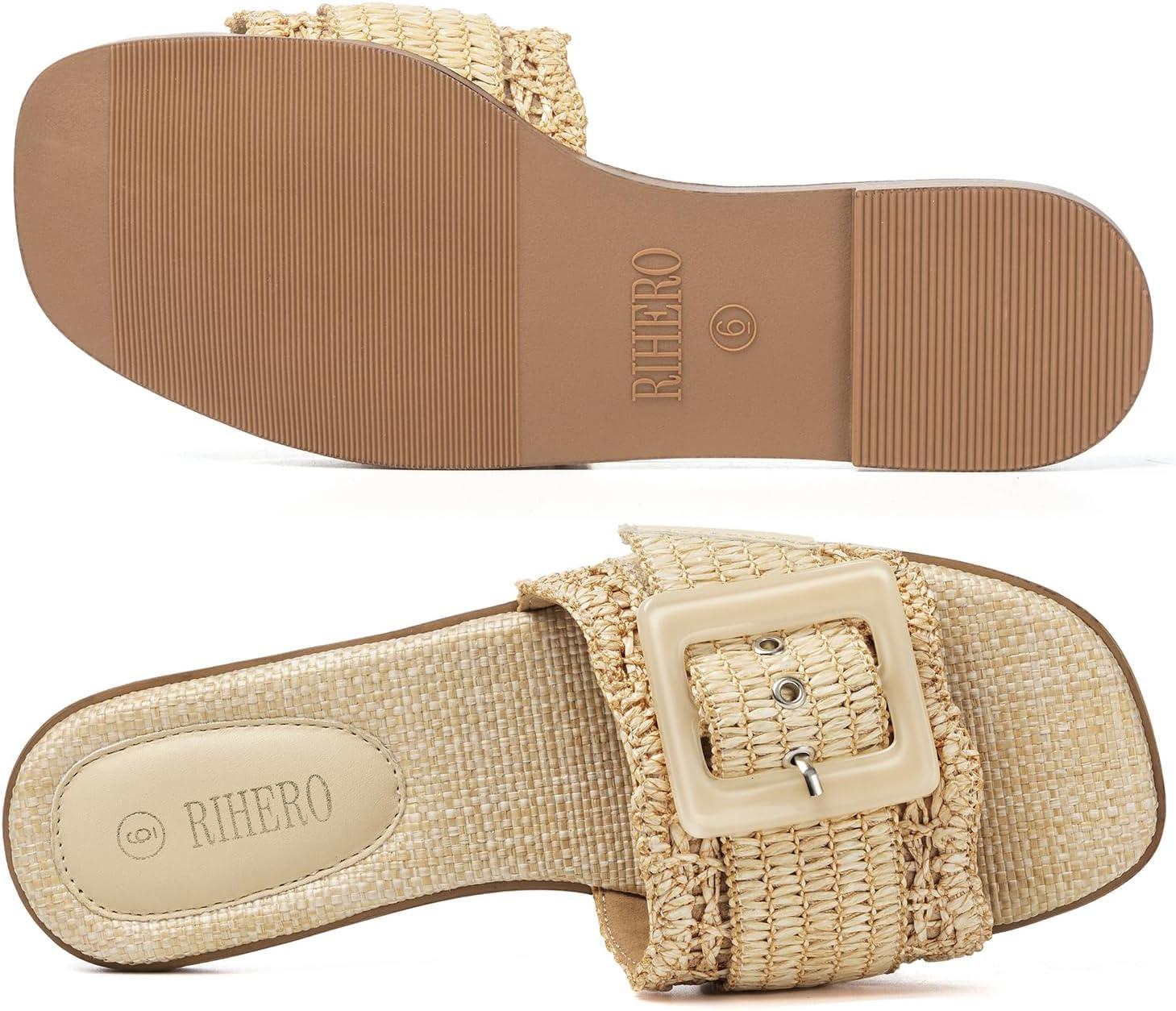 Rihero Women’s Raffia Flat Sandals Square Open Toe Summer Beach Slip On Woven Buckle Slide Sandals(Natural)