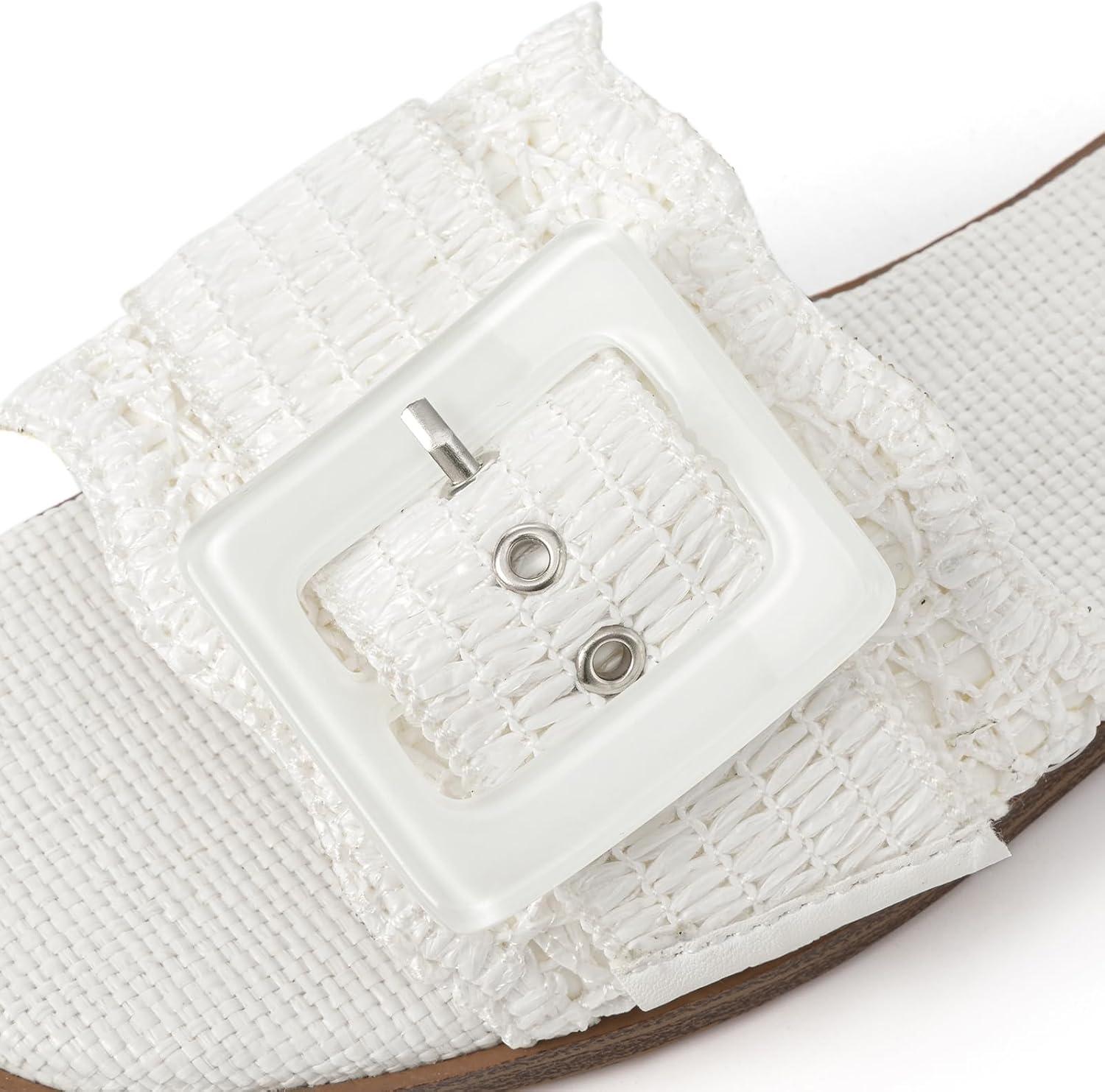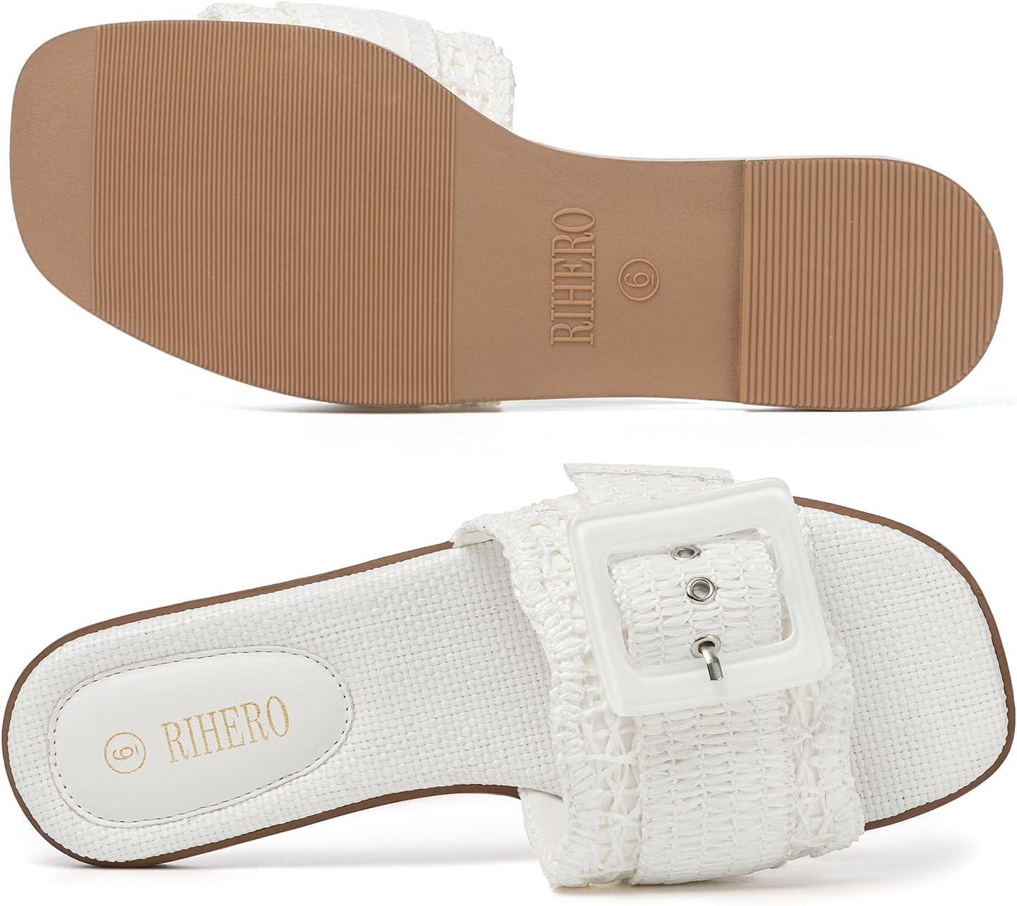 Rihero Women’s Raffia Flat Sandals Square Open Toe Summer Beach Slip On Woven Buckle Slide Sandals(White)