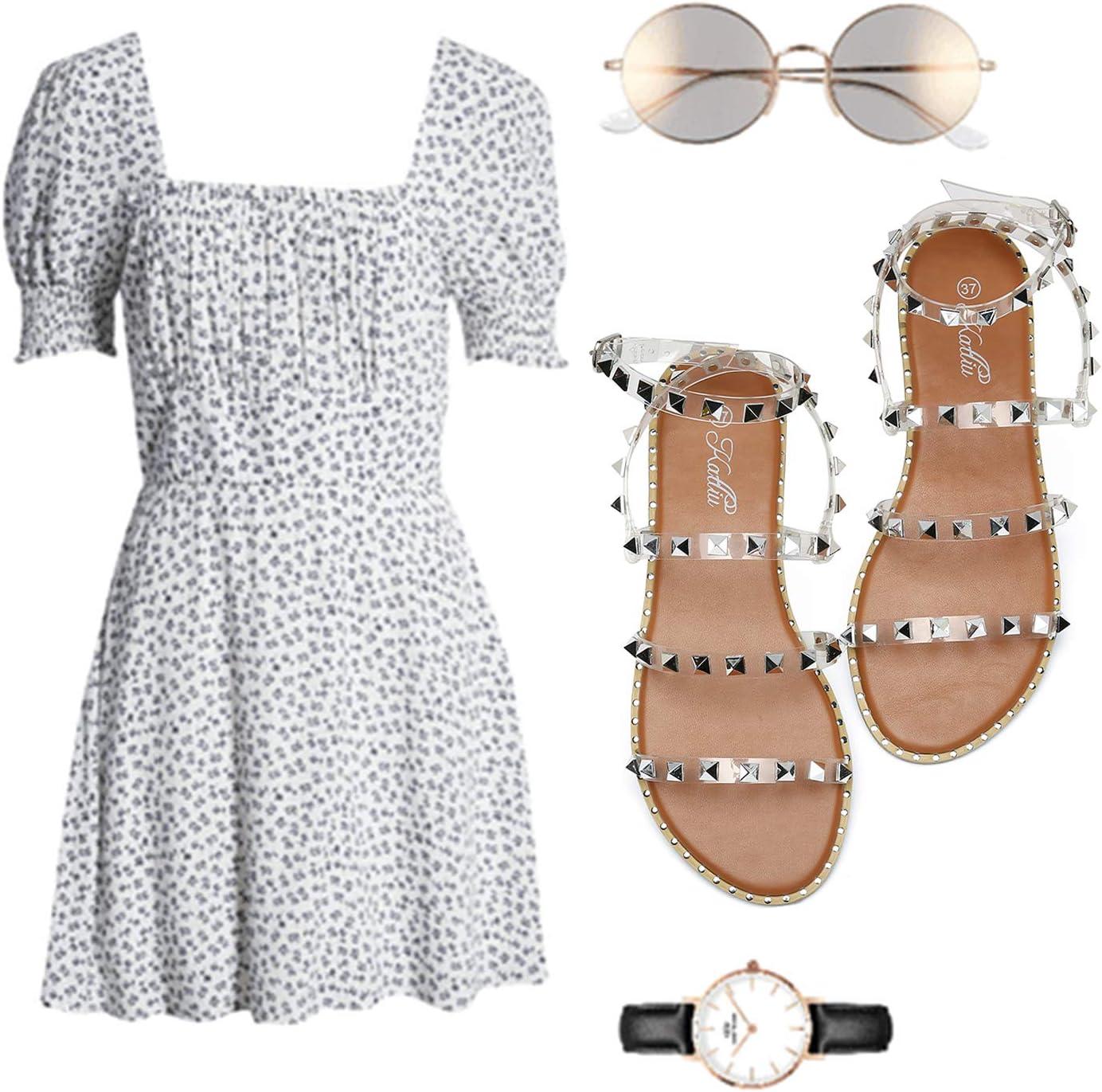 katliu Women’s Flat Sandals Strappy Studded Sandals Gladiator Sandals with Ankle Strap(Clear)