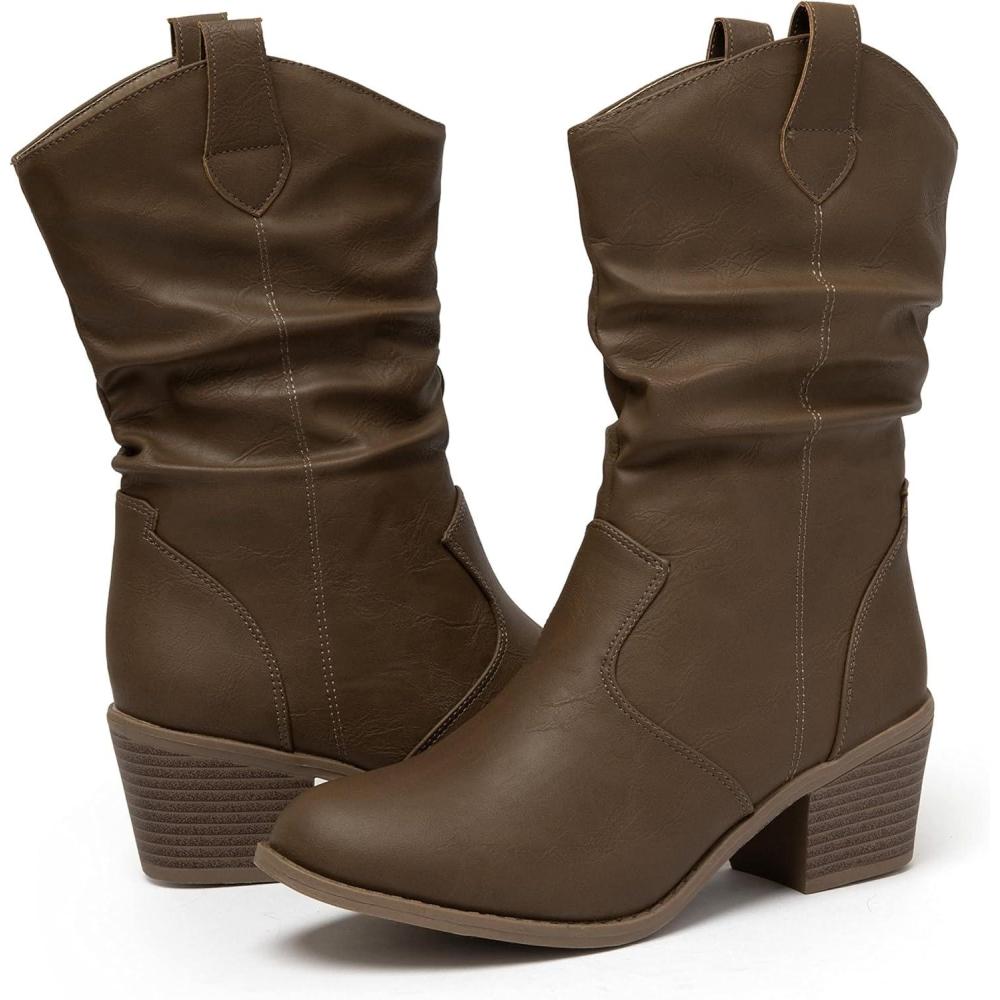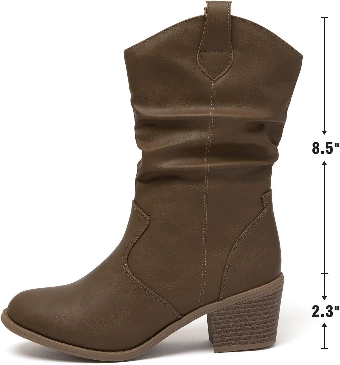 katliu Women’s Western Cowboy Boots with Pull-Up Tabs Mid-Calf Boots Low Heel Khaki Size 9.5
