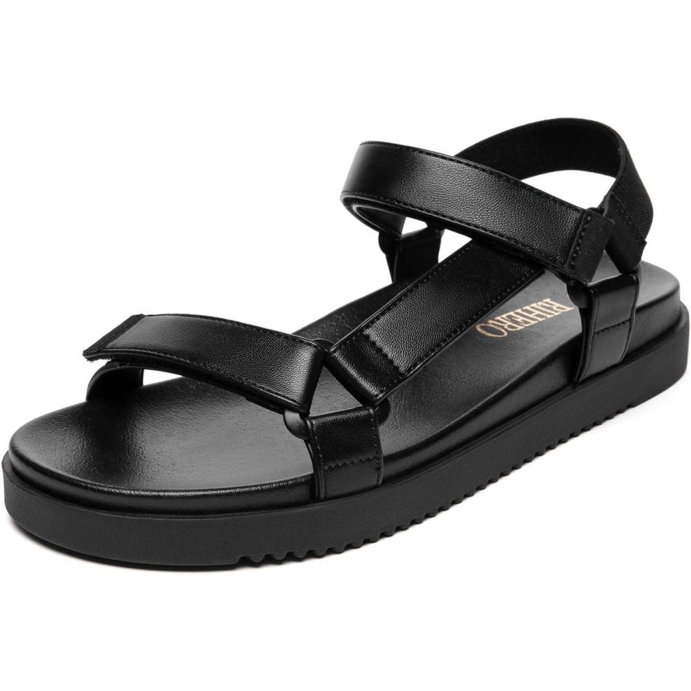 Rihero Women’s Flat Sandals Comfortable Open Toe Adjustable Strap Walking Footbed Sandals(Black Pu)