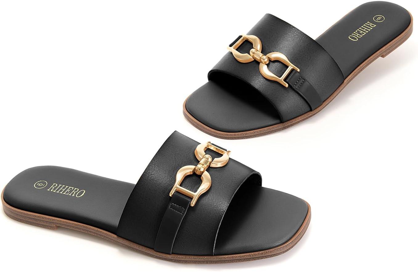 Rihero Women’s Flat Sandals Summer Comfortable Square Open Toe Slip On Leather Slide Sandals(Black)