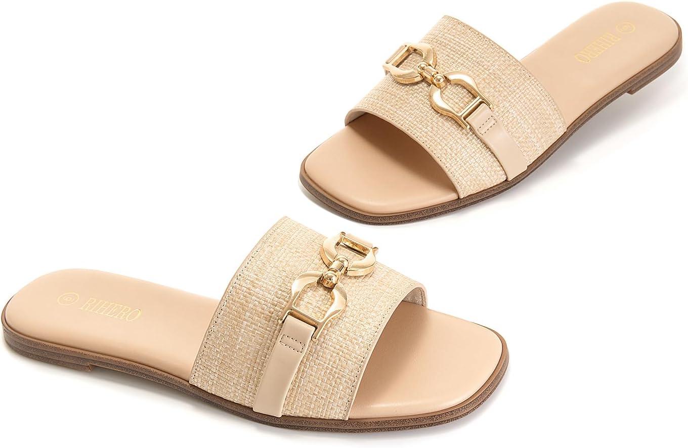Rihero Women’s Flat Sandals Summer Comfortable Square Open Toe Slip On Leather Slide Sandals(Raffia)