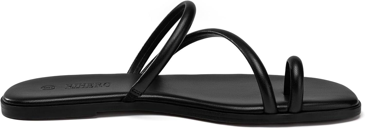 Rihero Women’s Slide Sandals Comfortable Square Toe Beach Slip On Strappy Thong Flat Sandals(Black)