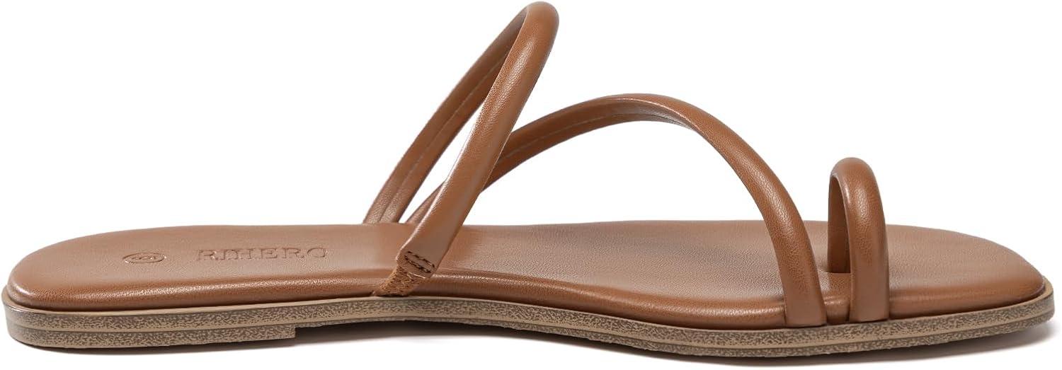 Rihero Women’s Slide Sandals Comfortable Square Toe Beach Slip On Strappy Thong Flat Sandals(Brown)